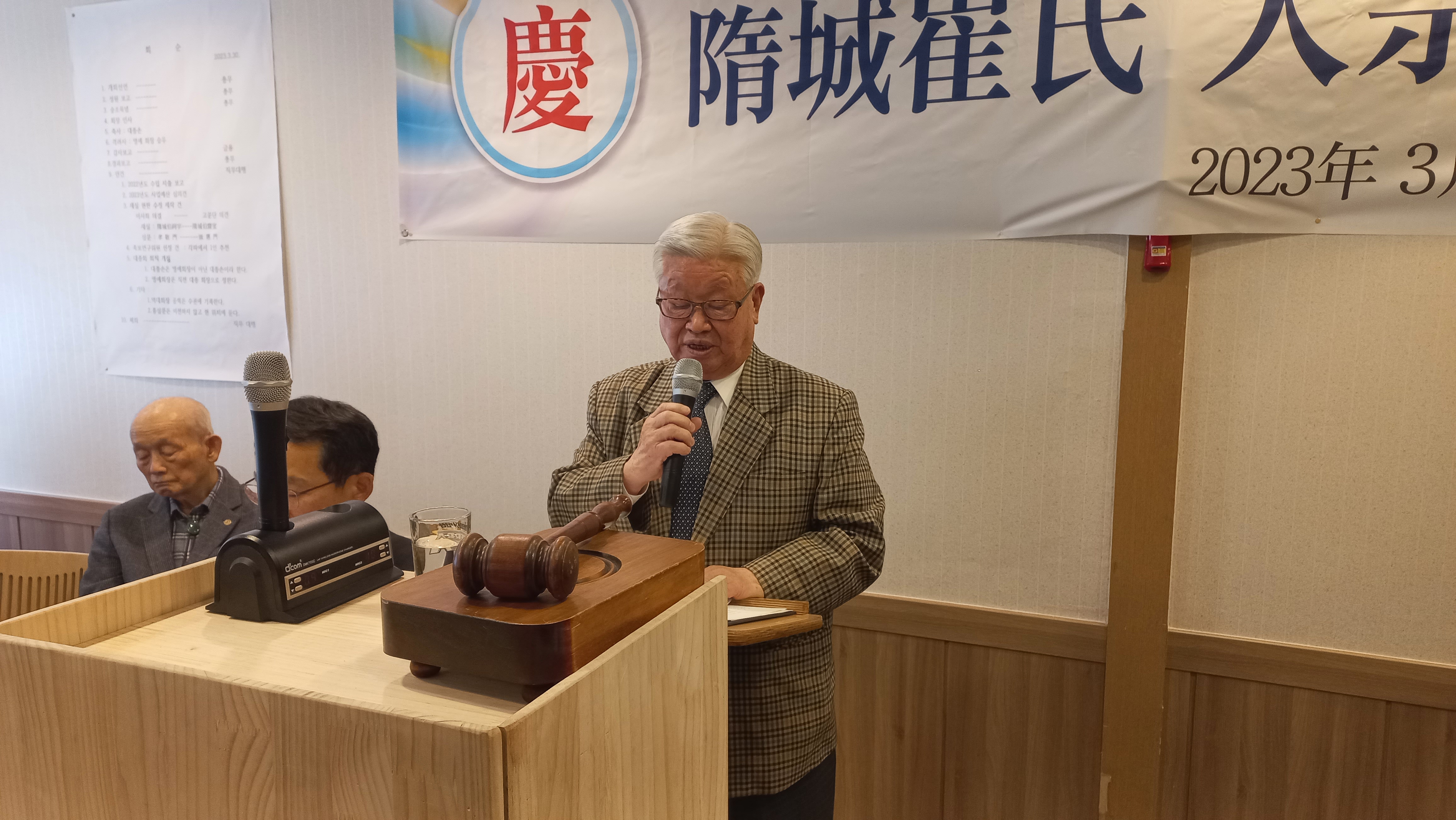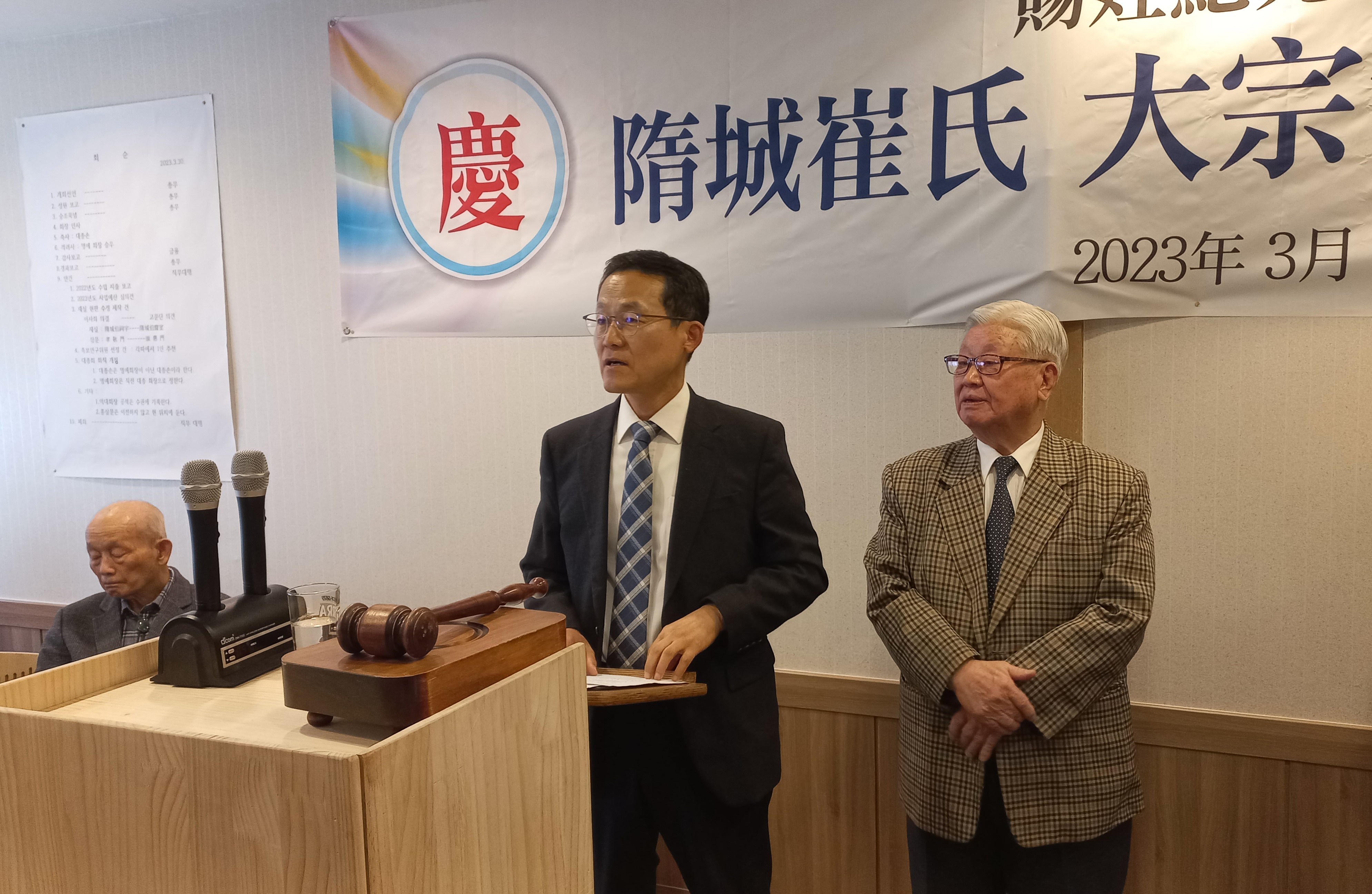 수성최씨대종회 정기총회를 2023년3월30일 수원시 세류역 앞 석산정에서 직무대행 귀용.총무이사 유식 외 고문.자문위원.상임이사 감사.이사.대의원이 참석하여 진행하였다.