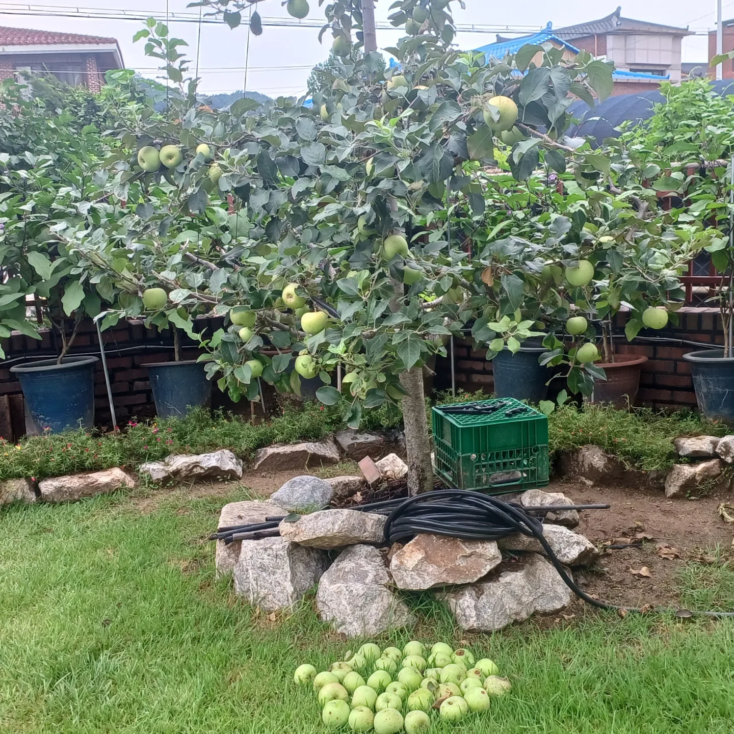 정원에 5년차 애지중지 키우던 사과 부사. 탄저병과 싸우고 태풍 과 싸우고. 결과는 이렇게 많이 떨어졌어요!