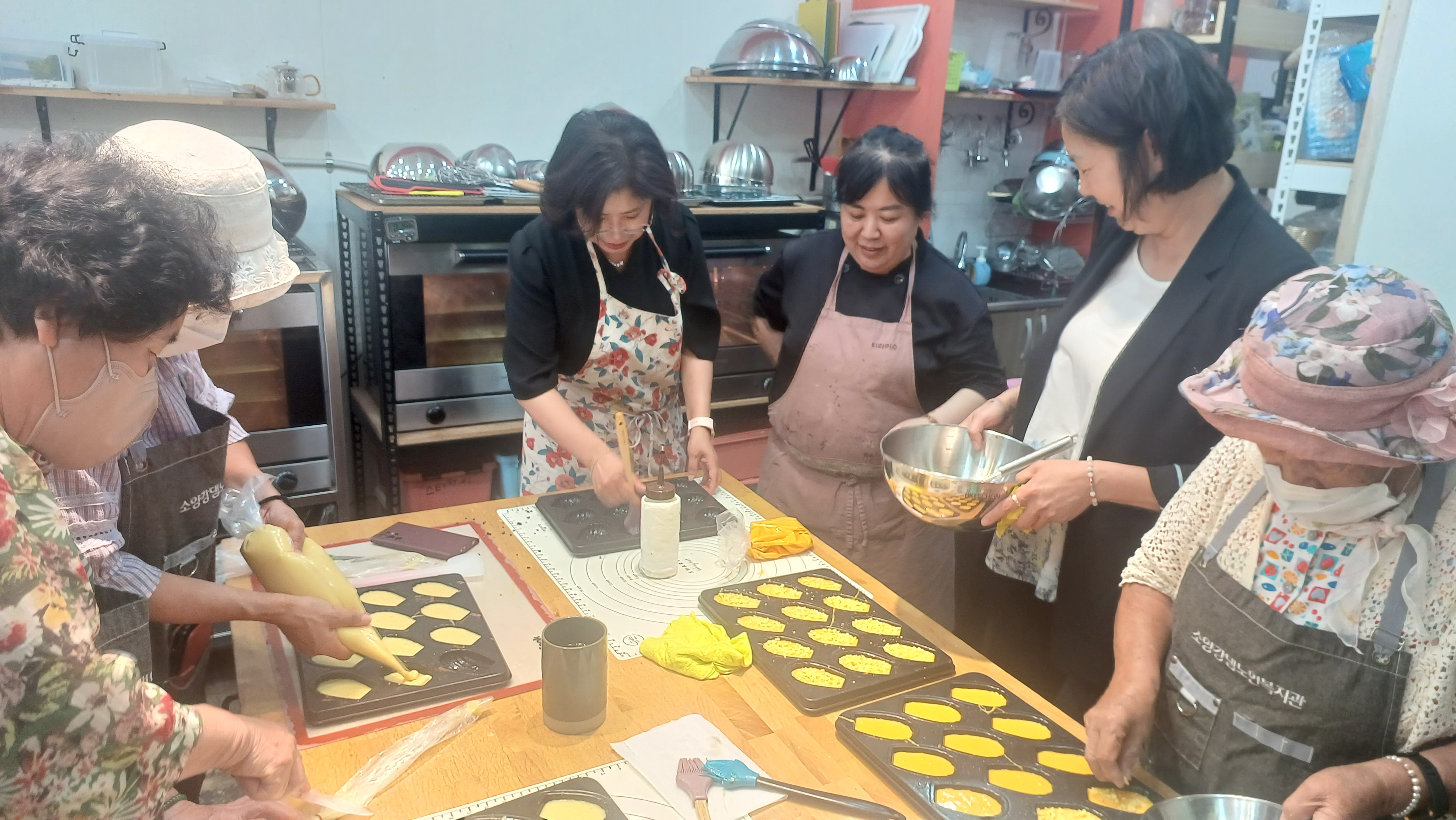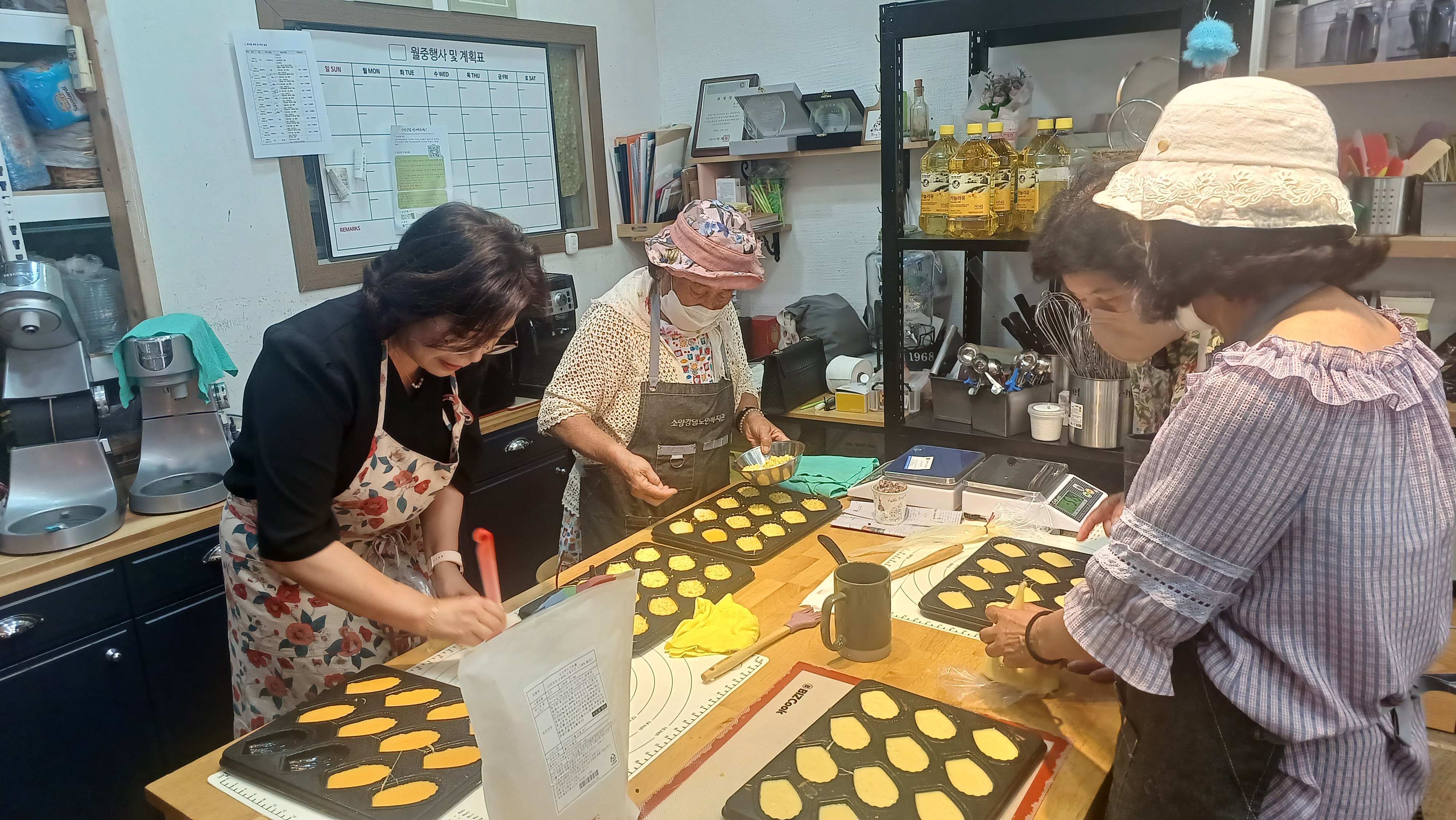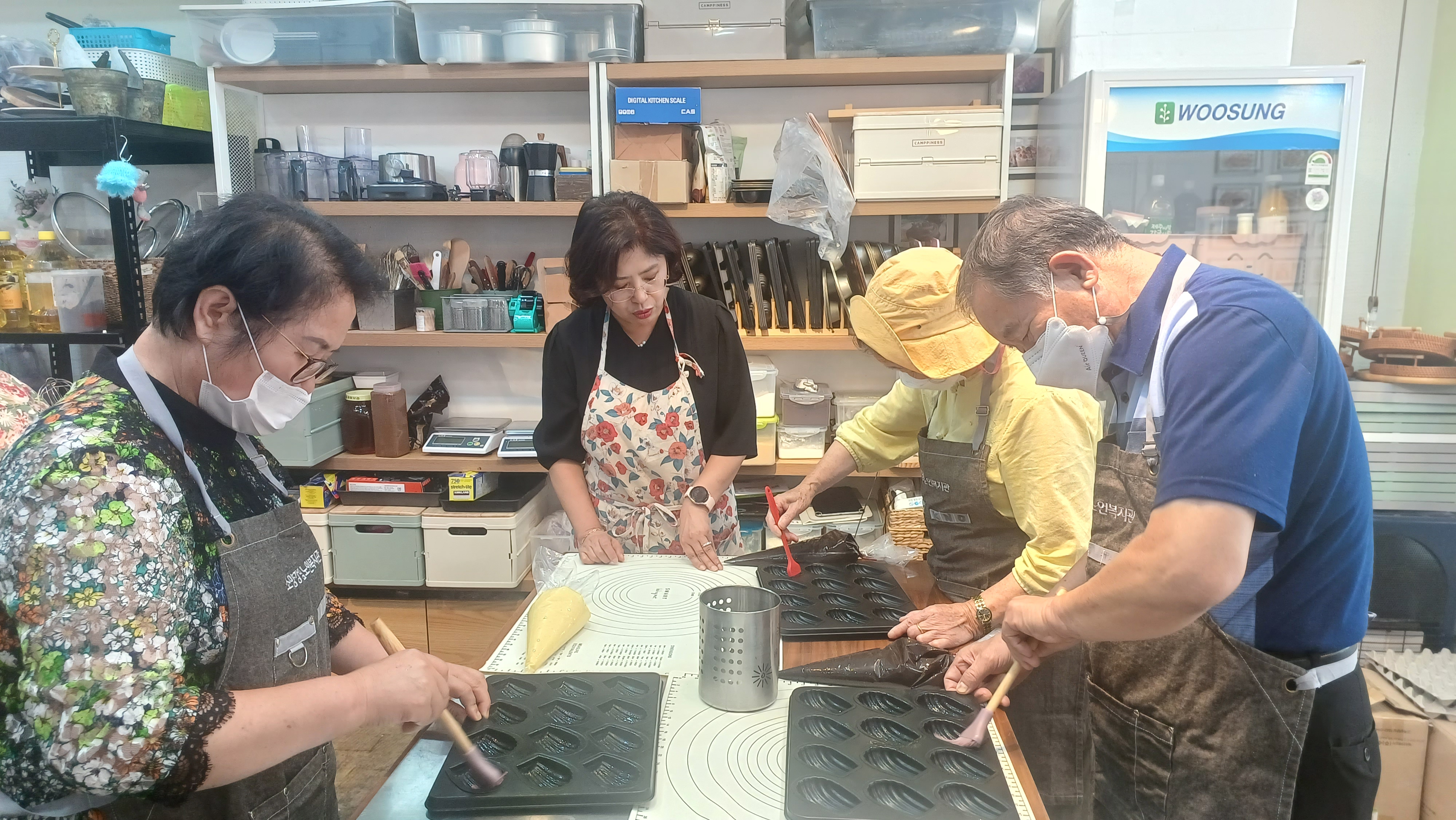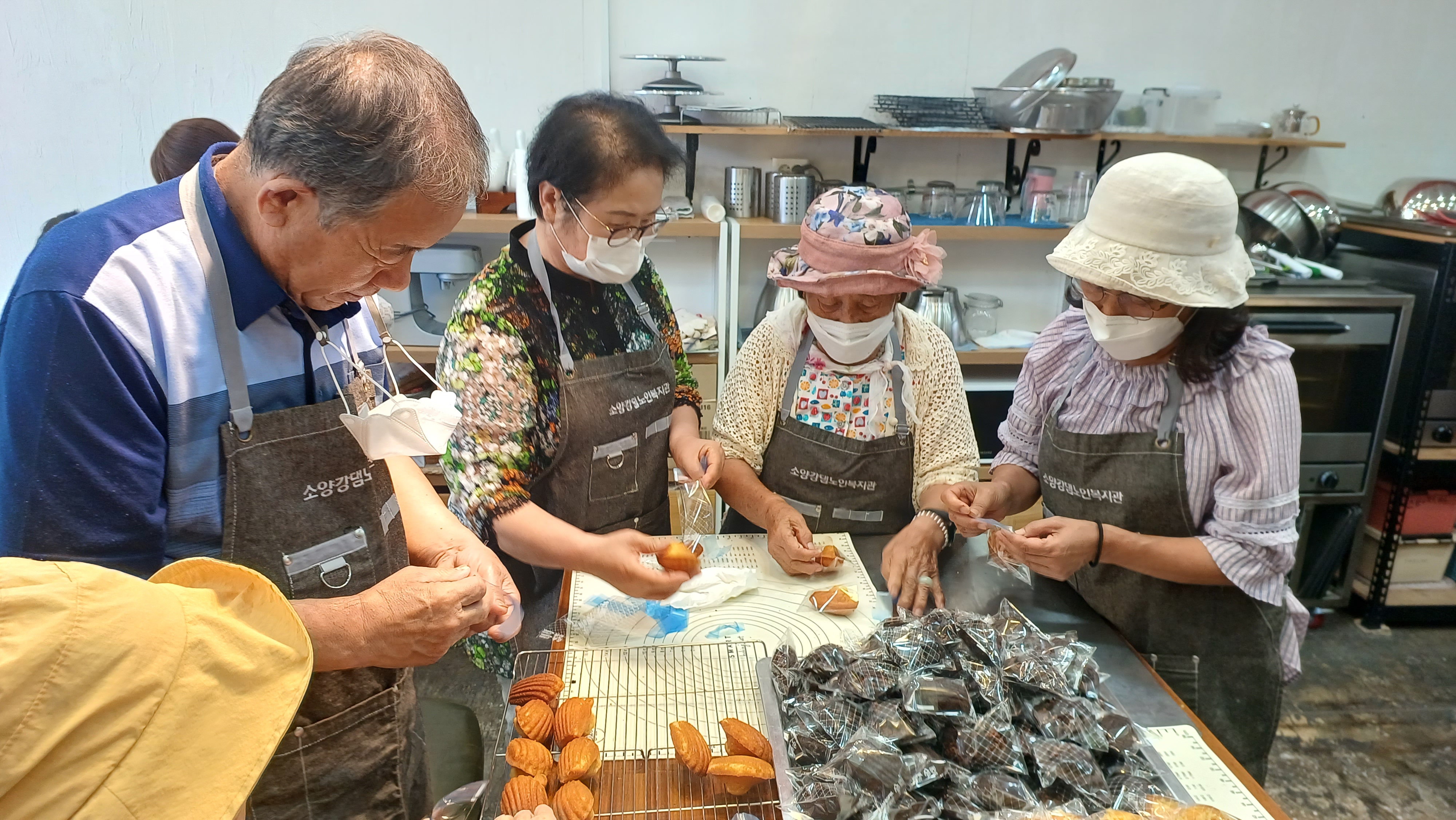 소양강댐노인복지관(관장 허미숙) 신북읍.사북면.북산면.동면 65세 어르신들에서 6명 선발하여 춘천시 효자로74-1(티라미수)제과(빵)만드는과정을 육동한 춘천시장 사모님과 복지관 관장님외 어르신6명과 2차 제과(빵) 베이킹 수업하면서 직접 반죽하고 만들고 굳고 포장하고 전과정을 실습하며 만들어 보았다.