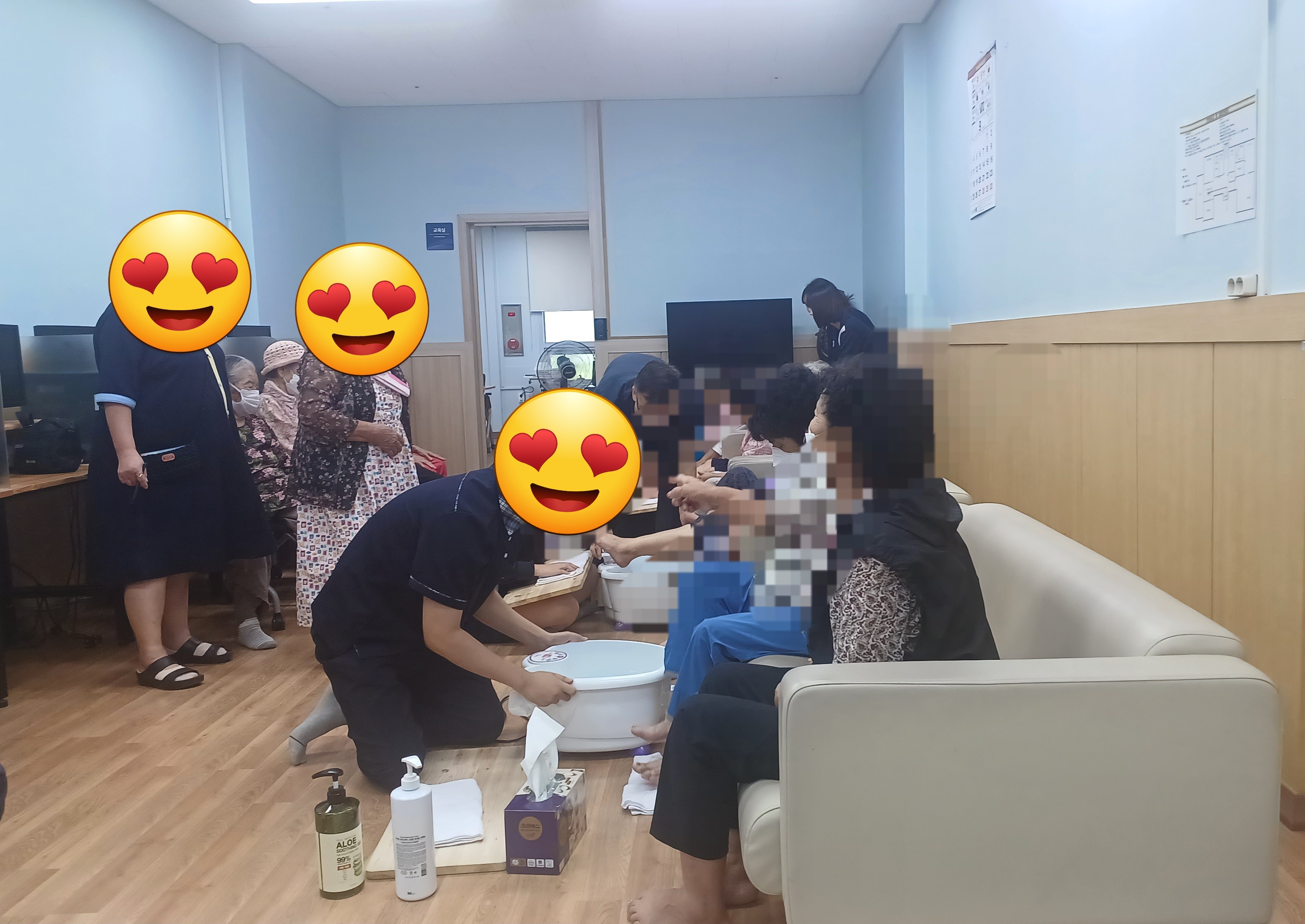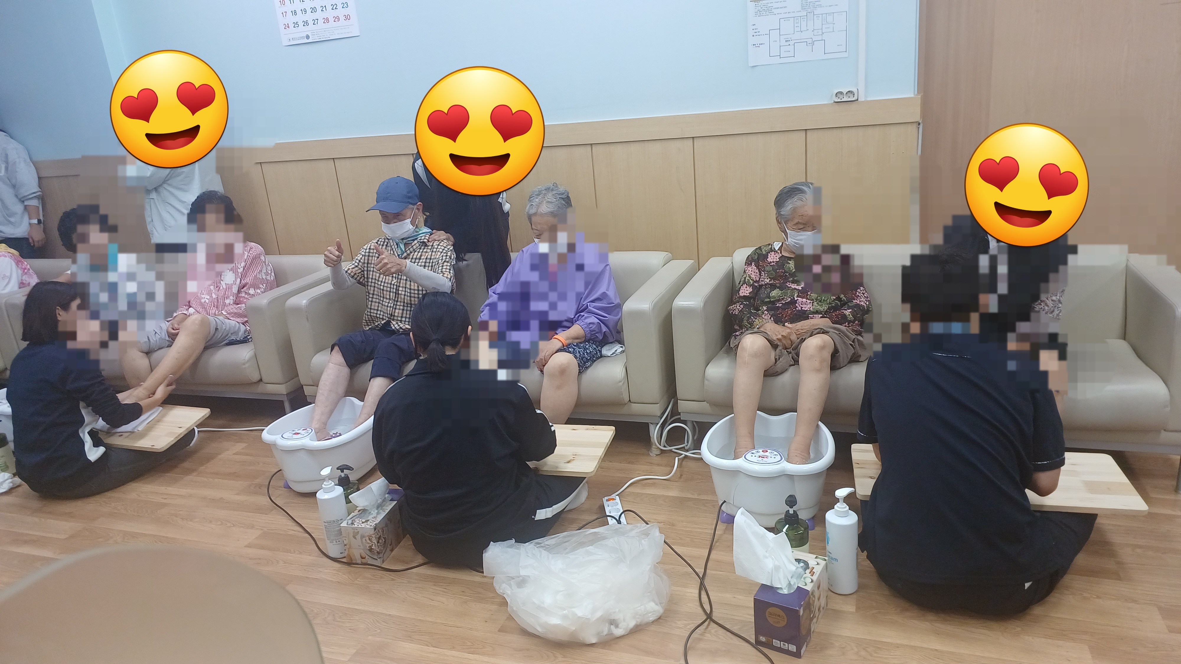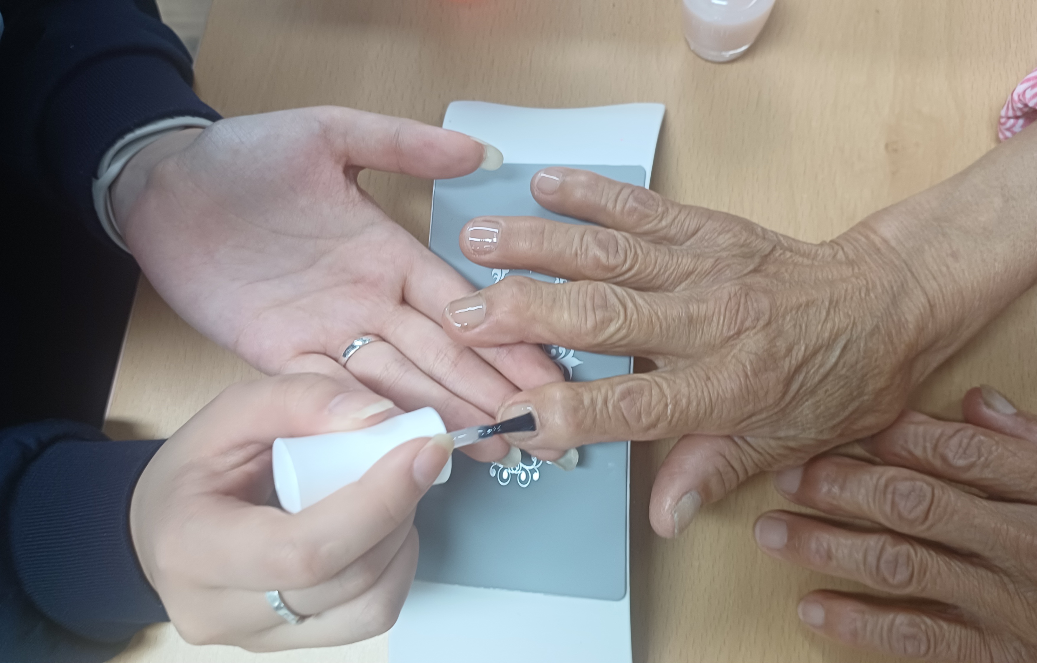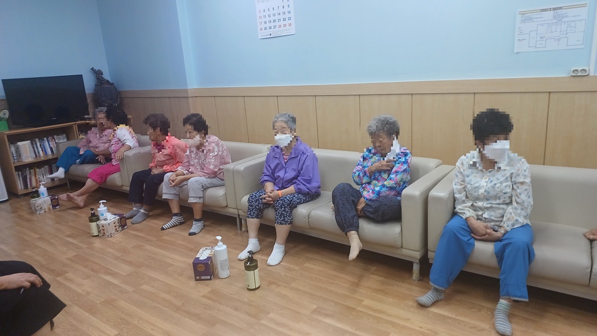 한샘고등학교 바이오코스메티 2학년5반 김0진양 노인들에 손톱에 메니큐를 발라드리고 있는데 노인들께서 무척 좋아 하신다.
