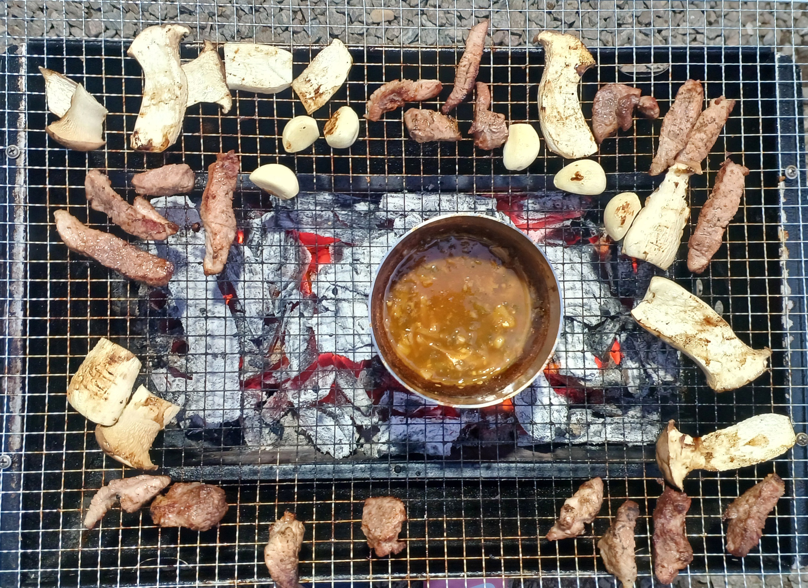 휴일저녁 가족들과 슻불피워놓고. 돼지고기.앞다리살과 삼겸살구워 맥주.소주 마시면서