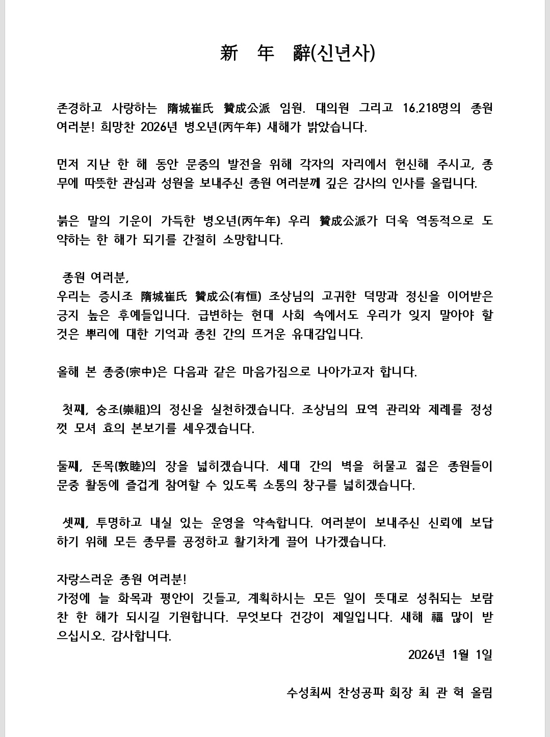 수성최씨 찬성공파 신년사